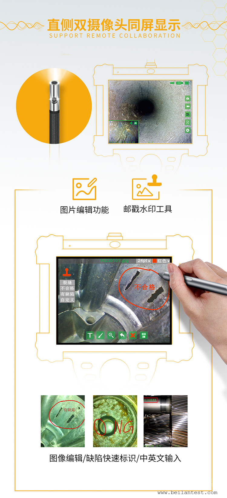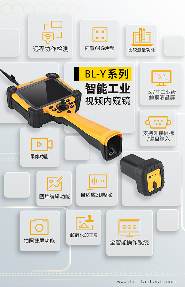 智能一体化手持工业视频内窥镜BL-Y系列,目前高端智能的一款工业视频内窥镜,目前实现:自适应式降噪功能,抓拍高清图片,比较法测量能实现点对点、点对线、面积测量,自动缺陷检测提示,实时视频图片标注、标示、涂鸦、盖章定义等一系列实用功能,可以配合客户做视觉检测分析,远程协作互联互通,在航空航天、汽车制造等精密智能的视觉检测必备设备,Y系列工业视频内窥镜潜力不止如此,让我们一起拓展让它更好,定义智能工业视频内窥镜。