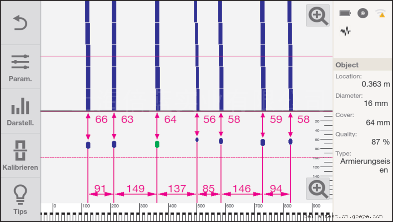 一次完成大面积钢筋分布情况的数据采集;精确检测大面积钢筋保护层厚度;确定钢筋位置、间距和直径。